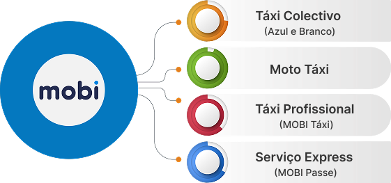 A MOBI é uma plataforma digital que centraliza e facilita o acesso a diversas modalidades de transporte urbano de passageiros. Disponibiliza serviços como táxis colectivos (Azul e Branco), moto-táxis, táxis profissionais (MOBI Táxi), pequenos táxis (Gira-bairro) e o serviço express (MOBI Passe), oferecendo mais comodidade, rapidez e segurança na mobilidade urbana.